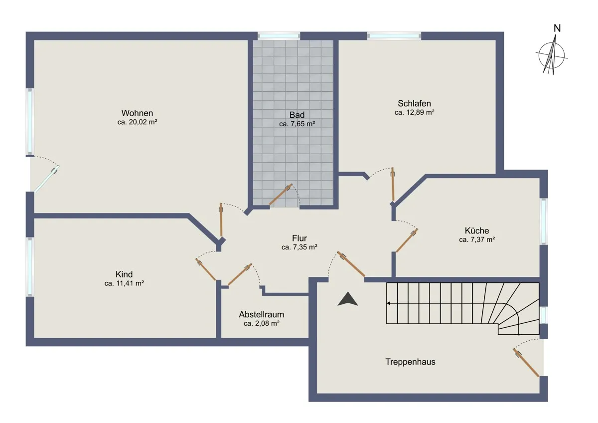 Die Wohnung bietet mit ihren ca. 72,5 m² Wohnfläche, verteilt auf das Wohnzimmer mit ca. 20 m², die beiden Schlaf-/Arbeits-/Kinderzimmer mit 12,89 m² und 11,41 m², der Küche mit 7,37 m², dem Flur mit 7,35 m², dem Bad mit 7,65 m² und der Abstellkammer mit 2,08 m², alles was zu einem angenehmen wohnen benötigt wird.