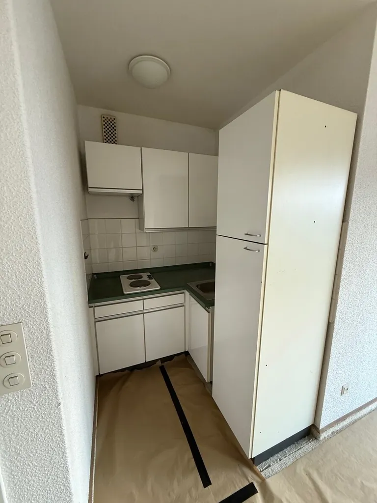 Bei der hier zum Kauf angebotenen Wohnung handelt es sich um eine praktisch geschnittene Fläche, bestehend aus einem großen Wohn- und Schlafzimmer mit einem Einzelfenster sowie einer großen Fensterfront mit Balkon, sowie einer kleinen Küchennische und einem Vollbad.